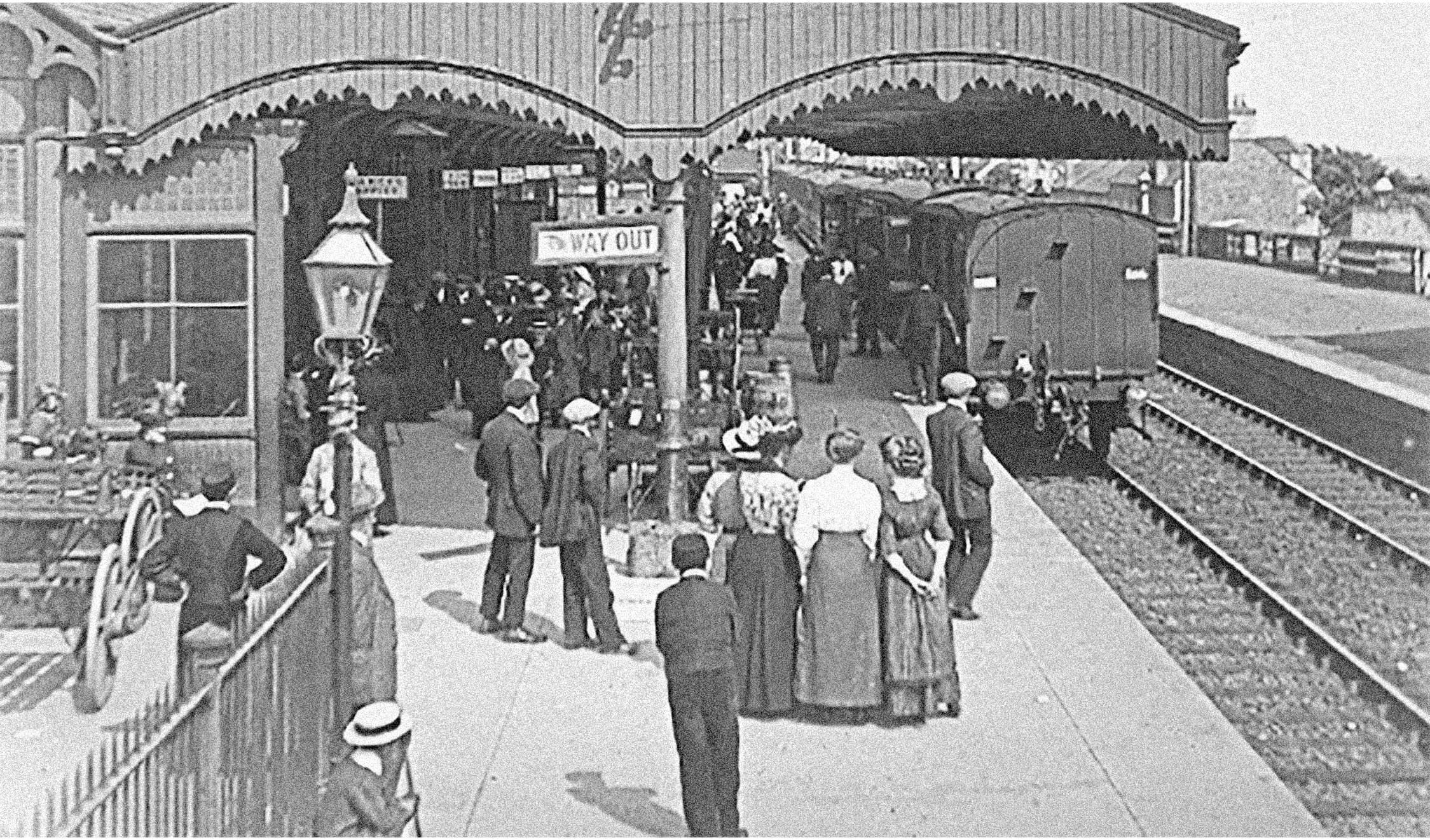Its station was opened on the wide gauge Dundee and Arbroath Railway on 6th October 1838. The original station, a small stone building was on the west side of Station Road to the north of the running line with goods yards to the north. The gauge was changed to standard gauge and a new station was opened in 1900, located to the east side of Station Road. It was a late example of a canopy resting on highly ornate cast iron cantilevers. It was demolished in 1986.